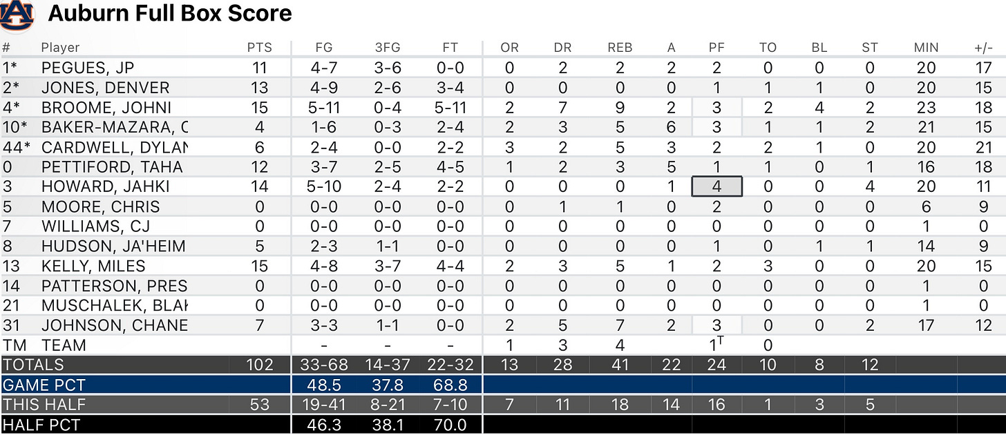 The Tigers shot 48.5 percent from the field (averaged 47.6 percent in 2023-24), 37.8 percent from three (35.2 percent in 2023-24), and 68.8 percent from the line (75.0 percent in 2023-24). Miles Kelly, JP Pegues, Pettiford, and Jones shot 10-22 from deep on their own. Auburn also had 22 assists to just 10 turnovers, after averaging 17.8 and 10.7 a season ago. Their 10 makes is more than Auburn had as a team in 25 of its games last season.